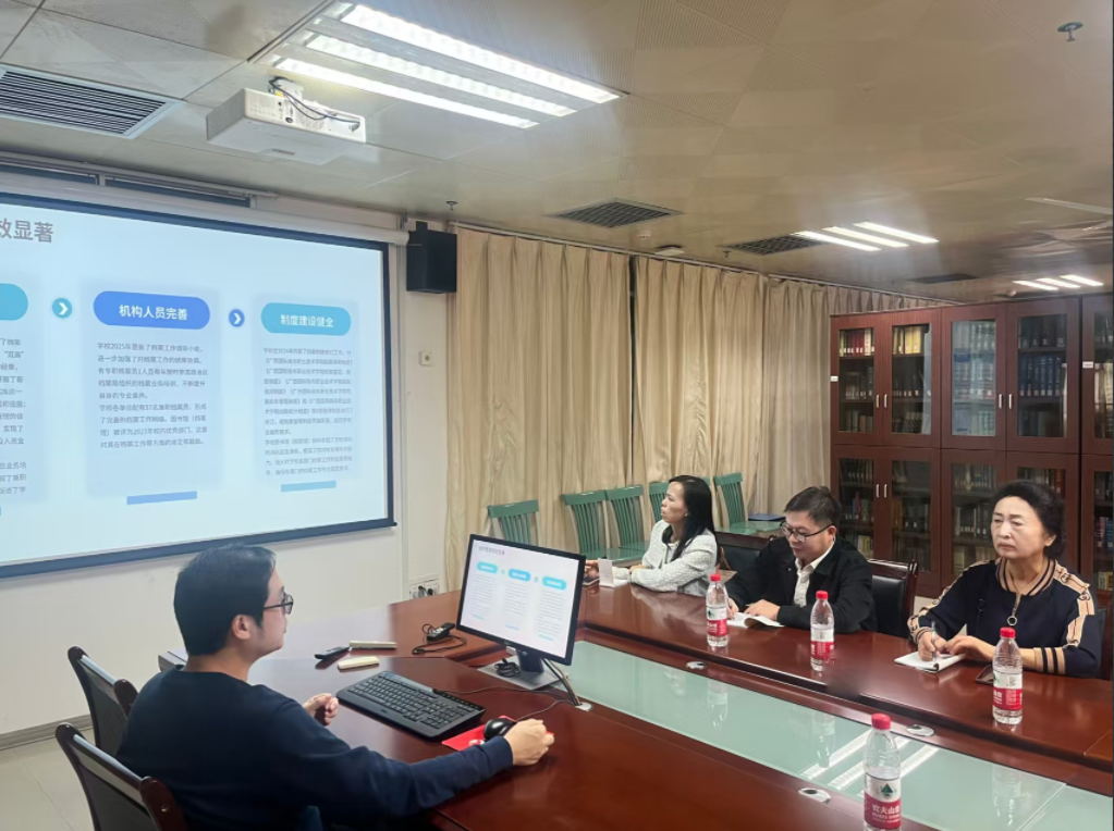 交流伊始,双方在广西国际商务职业技术学院档案馆会议室举行了亲切务实的座谈。广西国际商务职业技术学院档案冯副馆长对我校同仁的到来表示热烈欢迎,并详细介绍了该馆在制度建设、业务流程优化、库房科学管理、数字档案馆建设以及特色档案资源开发等方面的整体情况、创新举措与显著成效。