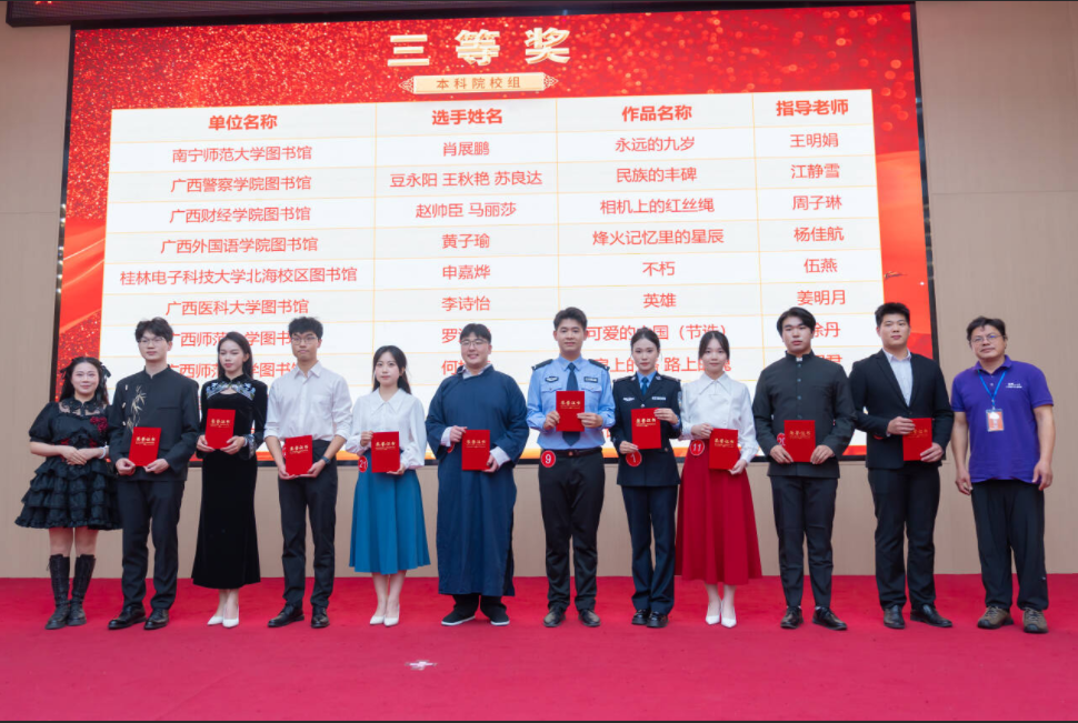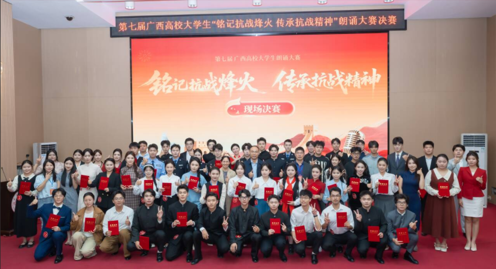 决赛落幕不是终点,而是精神传承的新起点。此次大赛为广西高校学子搭建了文化交流与自我展示的平台,不仅展现了当代大学生的青春风采与责任担当,更让抗战精神在声情并茂的演绎中代代相传。接下来,我校图书馆将持续推动红色文化进校园,通过优秀作品赏析、朗诵技巧分享会等形式,让更多青年学子走进历史、铭记历史,将抗战精神转化为奋进力量,在新时代的征程中书写青春华章。