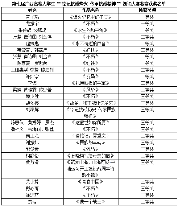 11 月 17日,第七届广西高校大学生 “铭记抗战烽火 传承抗战精神” 朗诵大赛决赛在南宁师范大学礼堂圆满落幕。本次朗诵大赛共有52所高校踊跃报名参赛,共收到13571个作品, 初赛阶段,各参赛单位精心组织、严格选拔,最终有247个优秀作品脱颖而出,晋级复赛。在复赛投票环节,总投票数高达63008票。访问次数248265次。经过层层激烈角逐,最终有37家单位的48个佳作成功入围现场决赛。