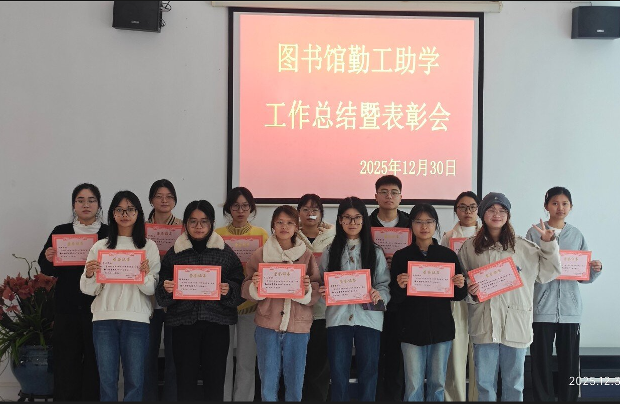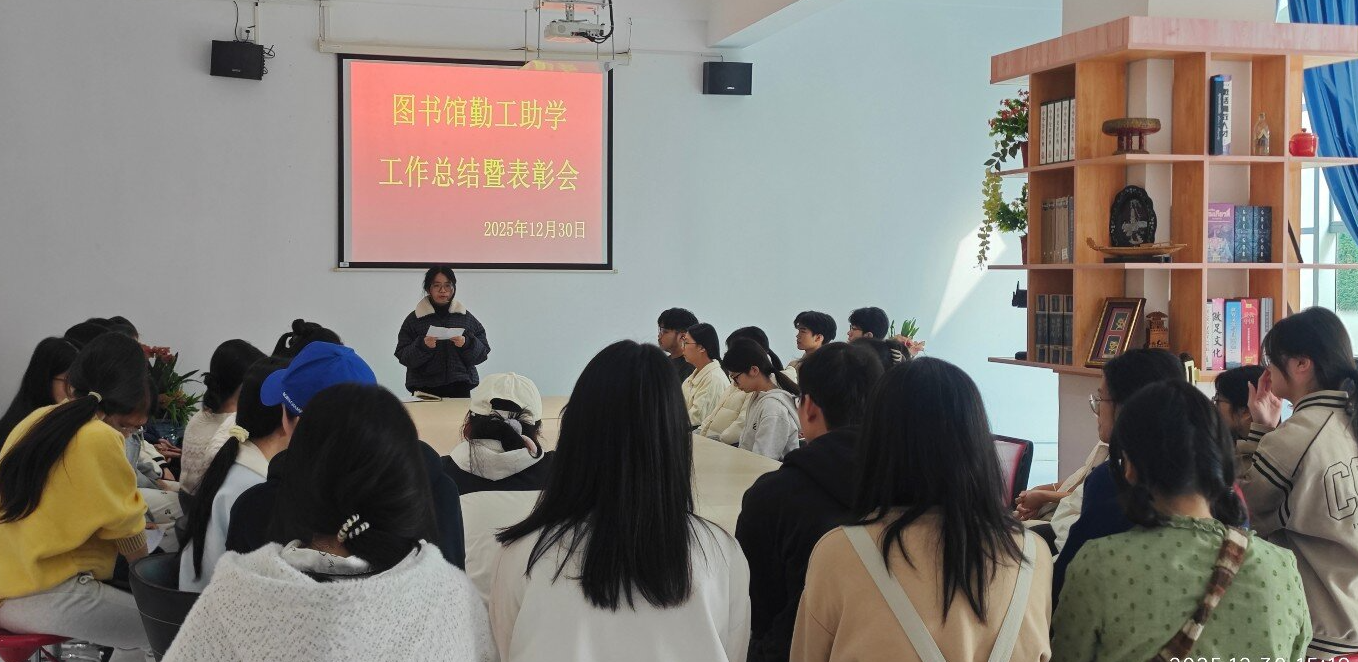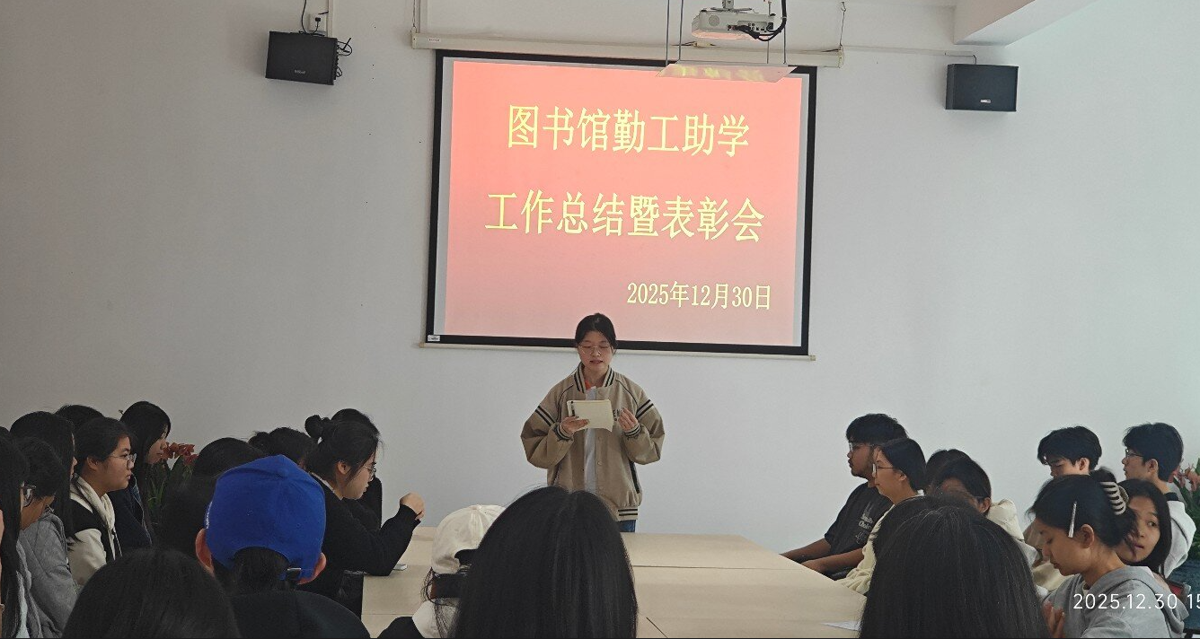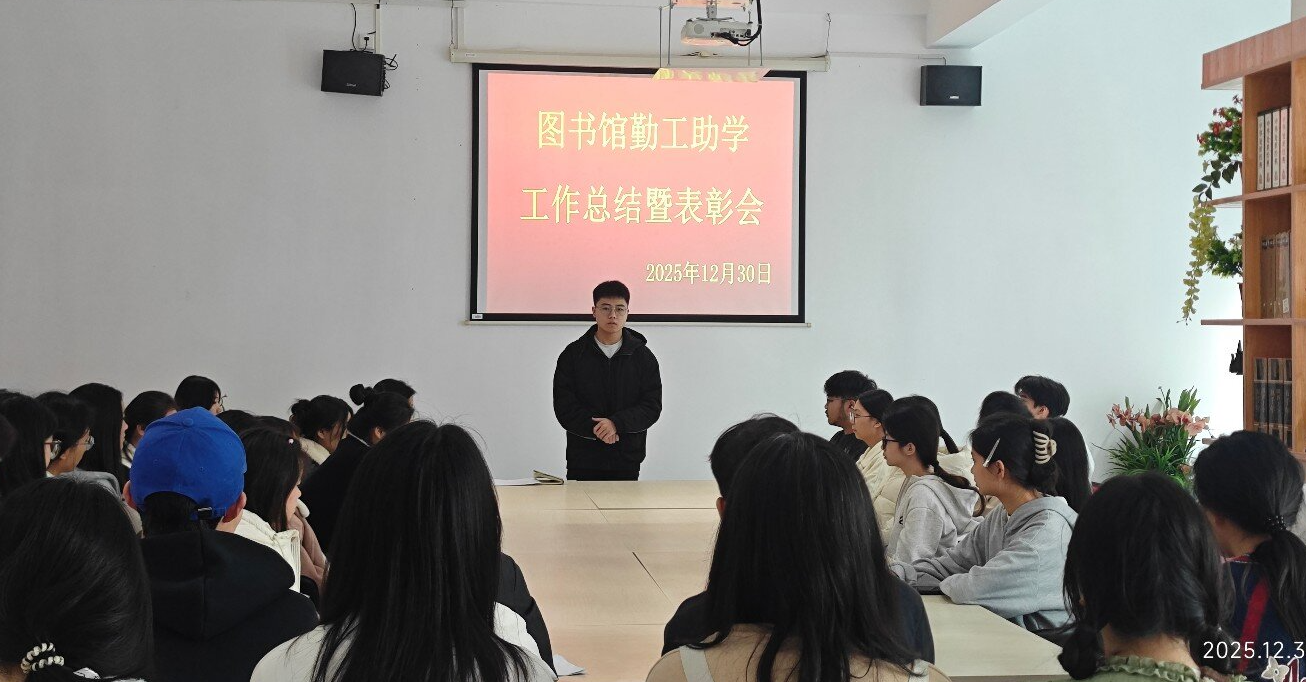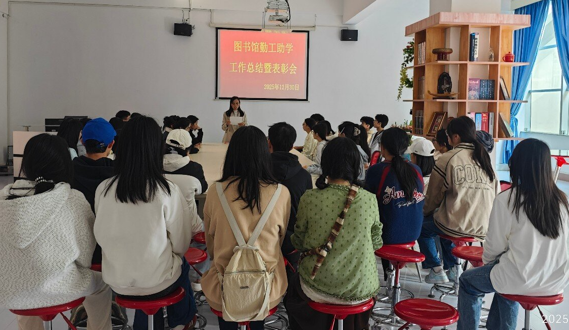 为全面总结勤工助学工作成果,表彰先进典型,进一步激发勤工助学学生的工作热情,提升图书馆服务质量,2025年12月30日下午15点,在图书馆三楼沙龙厅召开勤工助学工作总结暨表彰会。图书馆文海燕老师及全体勤工助学学生参加会议,会议由文海燕老师主持。